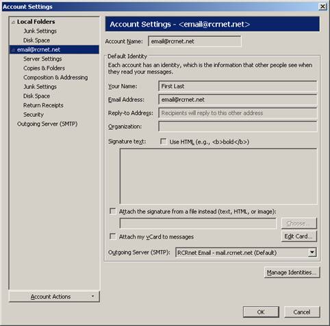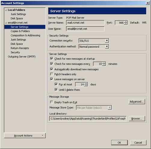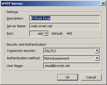 Outgoing Server Name=mail.rcrnet.net Connection Security=ssl Normal Password (if asked) Port 465 Thunderbird setup for RCRnet Incoming should look like this. Note security settings: ssl and normal password.